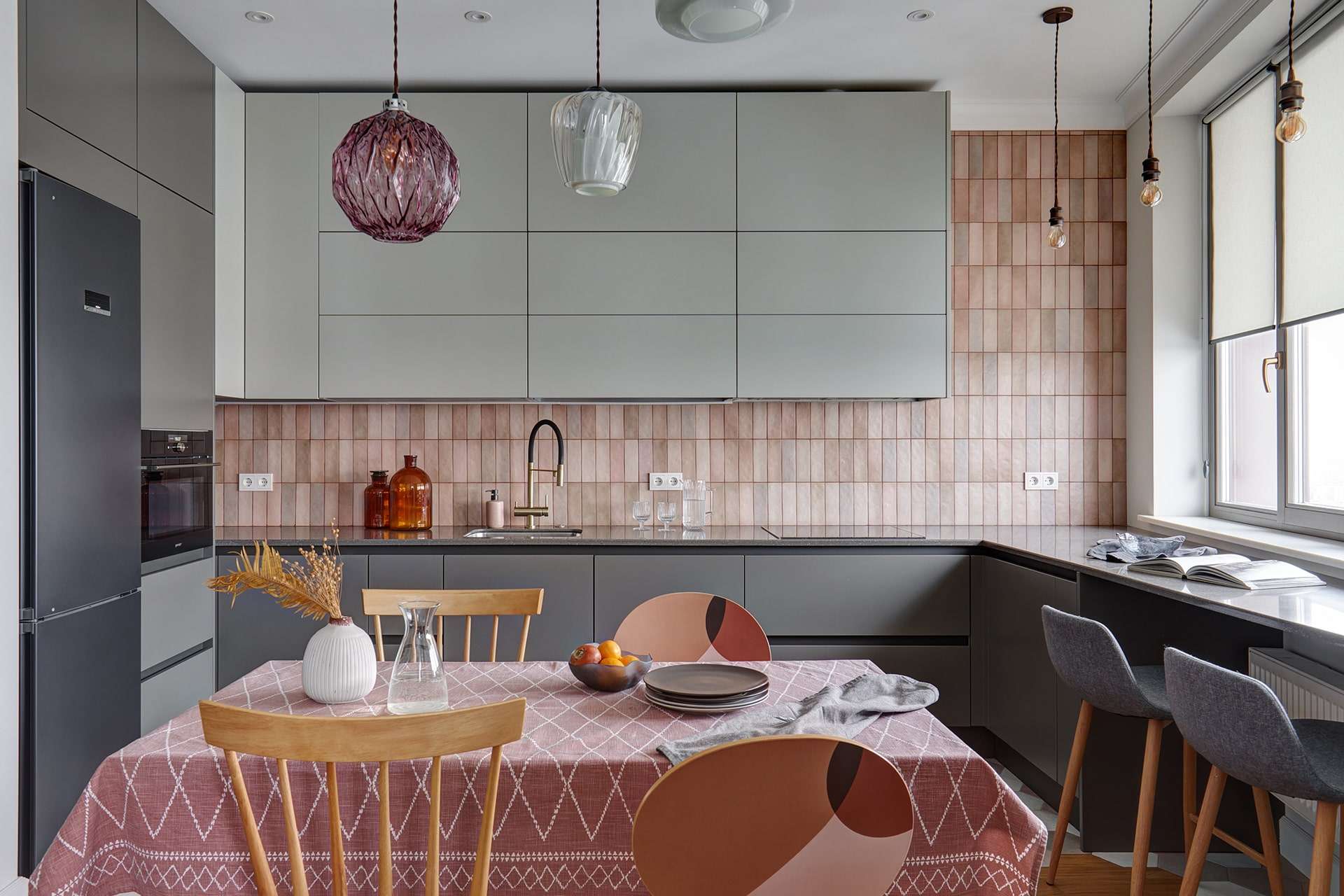 Думая о дизайнерских решениях, учитывайте не только свои вкусовые предпочтения, но и особенности планировки. Например, маленькая серая кухня будет хорошо смотреться со светлыми нежными акцентами, которые визуально расширят помещение, а для средних и больших пространств подойдут более насыщенные темные оттенки.